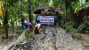 রাজাপুরে রাস্তায় কচুগাছ ও বীজ রোপন করে মাটির রাস্তা পাকাকরণের দাবিতে মানববন্ধন