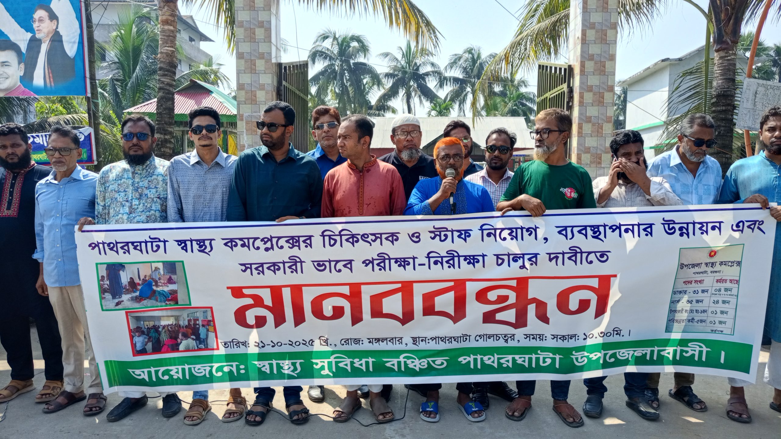 পাথরঘাটায় স্বাস্থ্যসেবার অব্যবস্থাপনা: চিকিৎসক নিয়োগ ও উন্নত সেবা দাবিতে বিক্ষুব্ধ জনতার মানববন্ধন